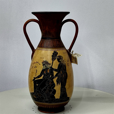 Κεραμικό βάζο. Χειροποίητο και ζωγραφισμένο στο χέρι. Κατασκευάζεται στην ΕΛΛΑΔΑ. ύψος 37 εκ. Στη μία πλευρά είναι ζωγραφισμένος ο θεός Δίας και η θεά Δήμητρα και στην άλλη ο θεός Απόλλωνας.